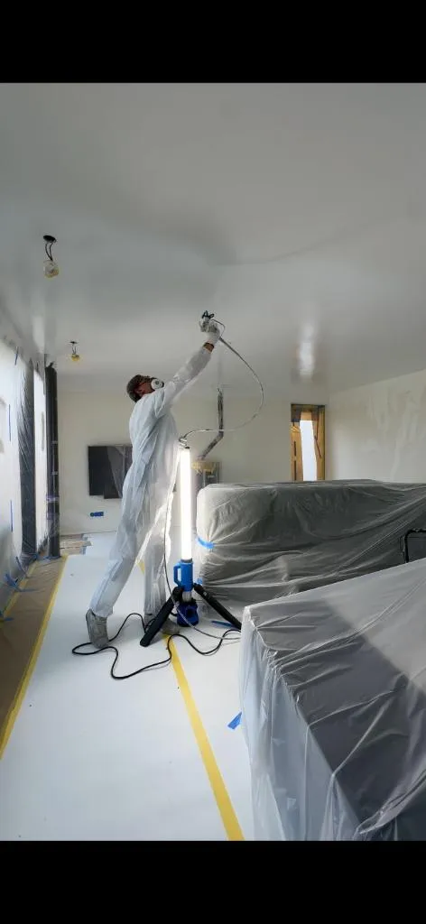 Strakke en egale afwerking van wanden en plafonds met airless spuittechniek.